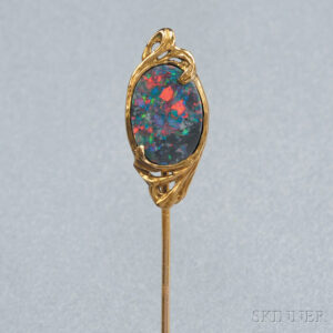 At a recent Skinner jewelry auction a gold stick pin with a black opal, in an Art Nouveau design was estimated at $1,000. However, interesting examples with metal stems and fake gem stones can cost under $100. Even less when found at a garage sale.