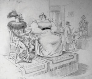 Not everything they did was political. Often they depicted current events in a humorous way. A good example is an early cartoon signed “Earhart” depicting a woman suffragette, dressed in men’s clothing. Another depicts a humorous carnival scene and by Opper.