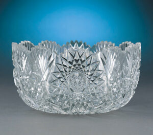 The art of cutting glass had its origins in Rome in the first century A.D. They created a clear glass they named “crystal”, that was cut into shallow geometric motifs. By the late 17th century the Germans “rediscovered” the techniques of cutting glass that spread to the glass houses of Bohemia. By the end of the 17th century, English glass makers used a new metal to make glass. However, it wasn’t till the late 18th and early 19th centuries that English and Irish cut and engraved flint glass. It became the new and important method for what came to be known as “brilliant “ cut glass. Early designs used geometric motifs. Some of the finest examples combined several geometric figures. The cutting completely covered the surface of the glass.